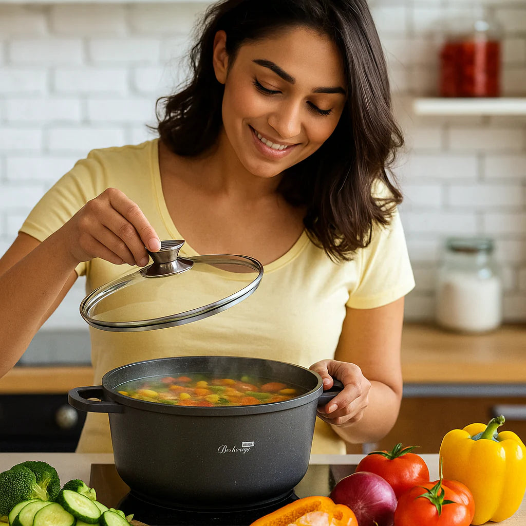 Főzz egészségesebben, stílusosabban és egyszerűbben a Bachmayer Home BM-7872 edénykészlettel! A prémium gránit bevonatnak köszönhetően az ételek nem tapadnak le, kevesebb olaj is elegendő, miközben a gyors és egyenletes hőeloszlás időt és energiát takarít meg.